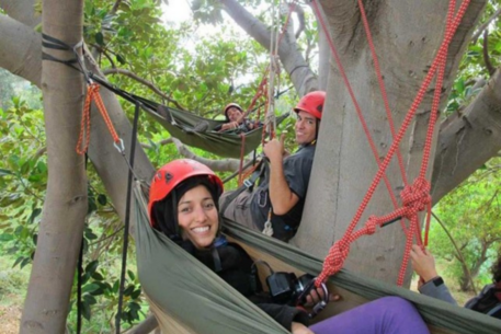 Vi overnatter i hængekøjer eller kæmpenet i trætoppene.Du har klatresele og hjelm på hele tiden, når du er i trætoppene.