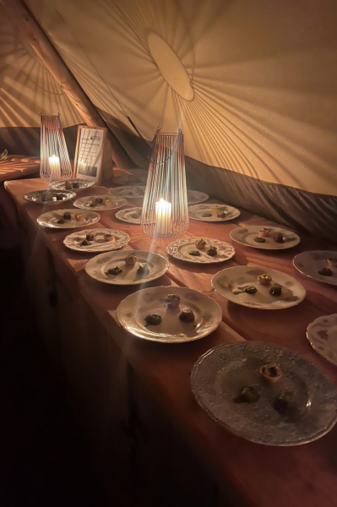 Når vi spiser, er vi med til at skabe en udendørs restaurant; vi dækker bordene pænt, måske endda med duge. Vi går op i dekorationer, som vi bruger tid på at samle og skabe af naturmaterialer. Vi spiser af smukt porcelæn og nyder kvalitetsdrinks i smukke glas.Campingstilen bliver til Glamping, når vi spiser.